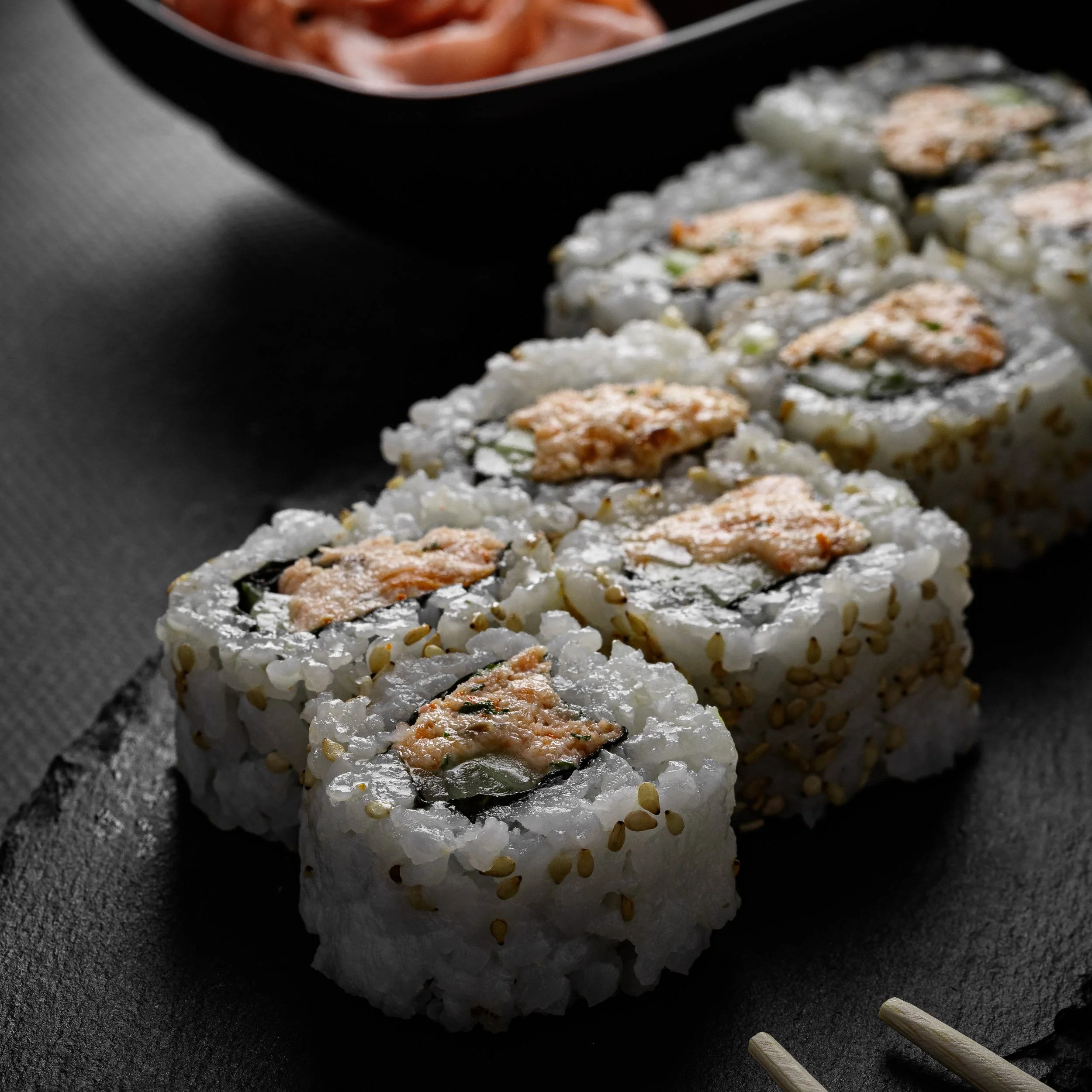 Tapis de riz abaissé sous feuille d’algue inversée graines de sésame noir.